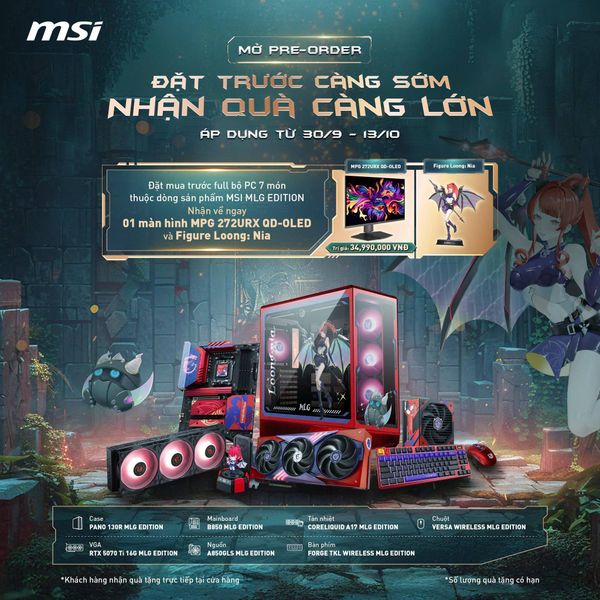 Từ ngày 30/09 – 13/10/2025, MSI chính thức mở chương trình Pre-order PC MSI MLG Edition với ưu đãi quà tặng siêu khủng dành riêng cho game thủ và tín đồ công nghệ.